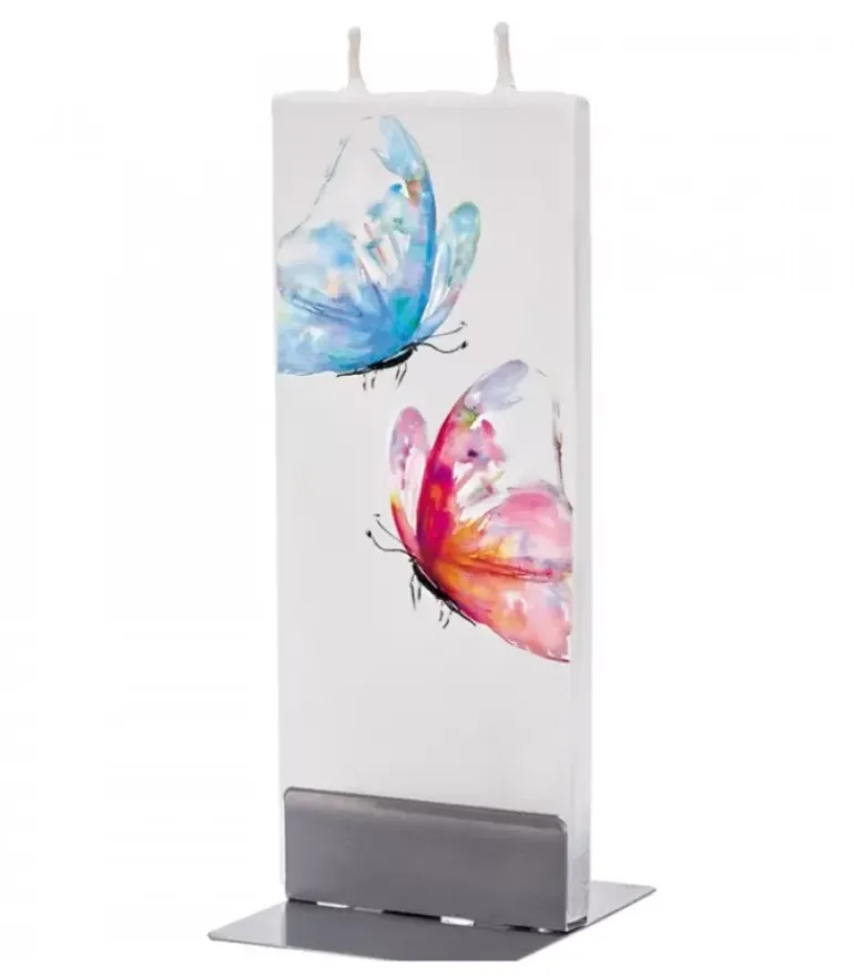 Bougie Décorative Double Meche, Motif Papillons Bleu Et Rouge.