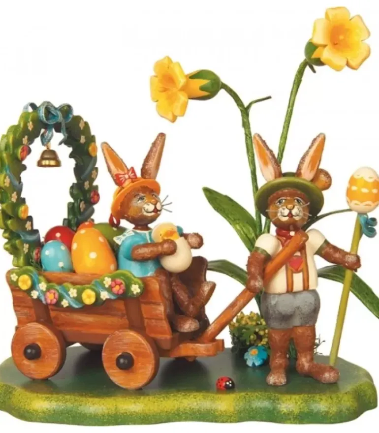 Famille Lapin De Paques Transportant Des Oeufs Dans Une Charrette Fleurie.