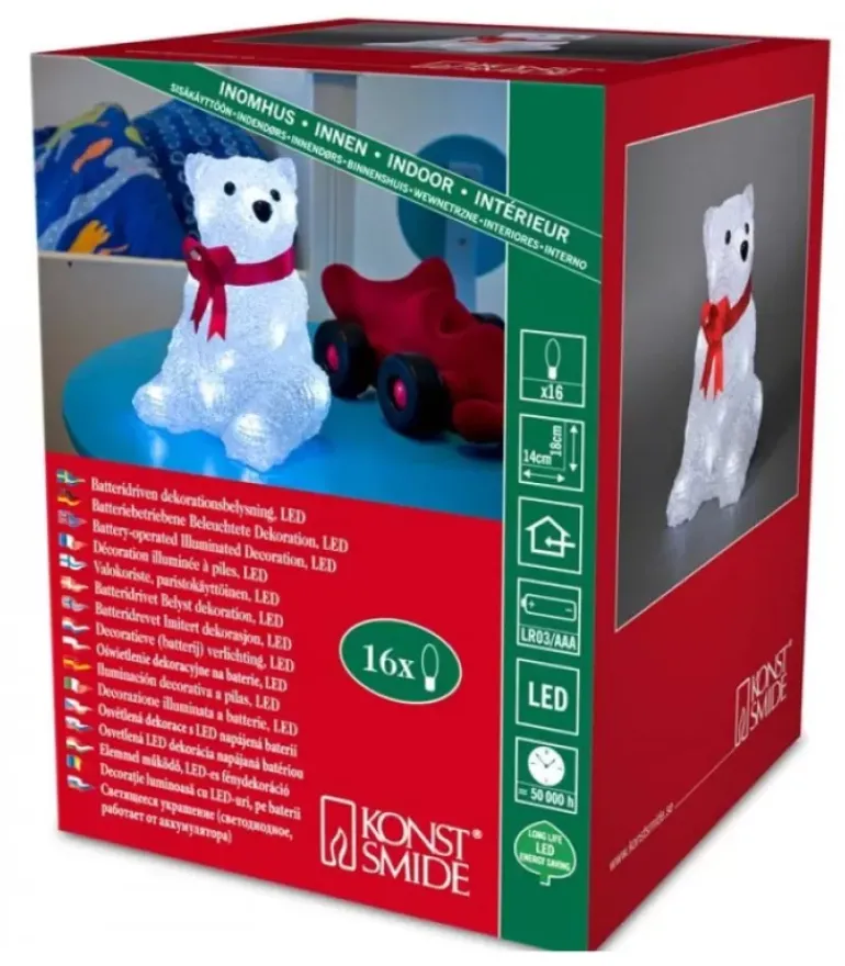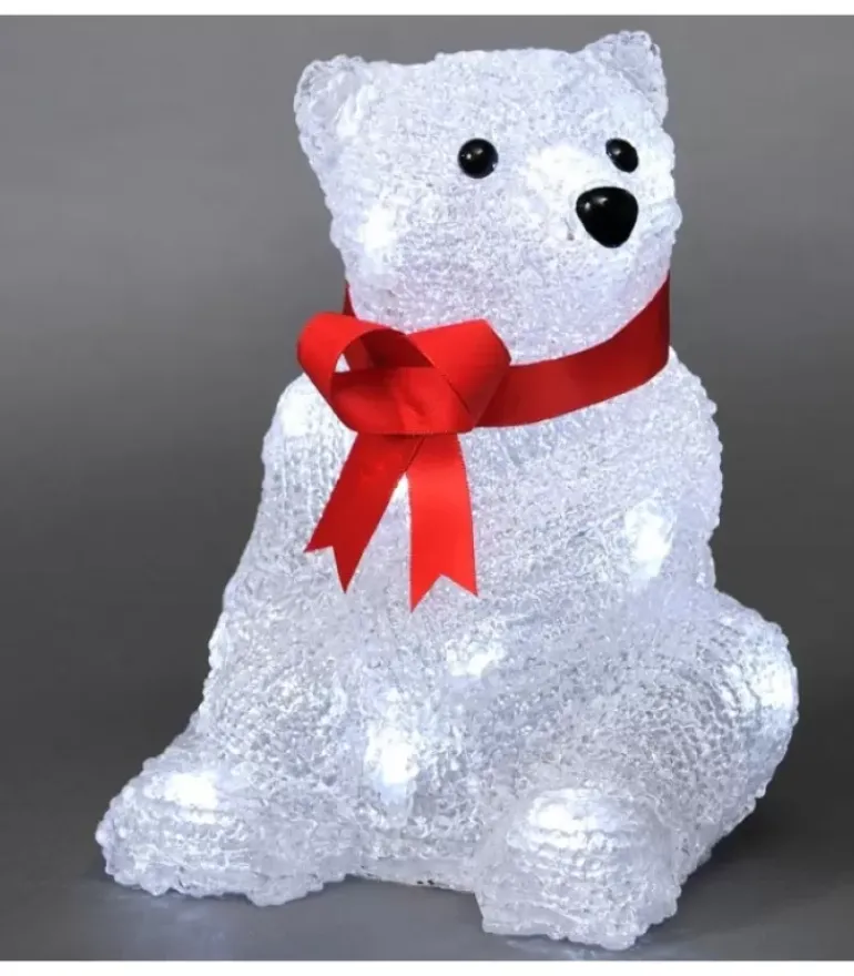 Petit Ours Lumineux A Led En Acrylique Avec Ruban Rouge, 16 Diodes Blanc Froid.