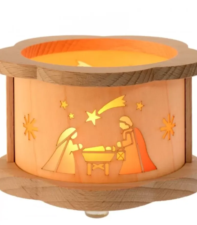 Petit Photophore En Bois Avec Motif Translucide Representant La Scene De La Nativite.