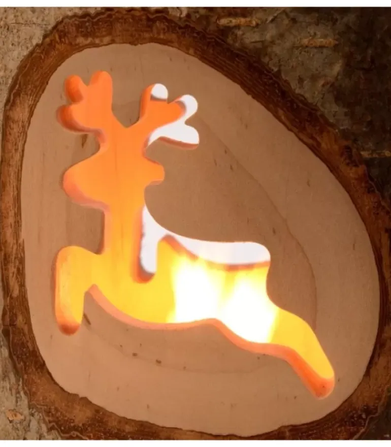 Photophore En Bois Avec 2 Motifs D’Un Renne Realise En Bois Cisele Sur Chaque Cote.
