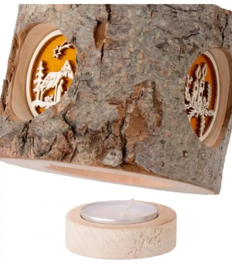 Photophore Dans Un Rondin De Bois Avec Trois Motifs Translucides : Bougies Sur Une Branche, Une Crèche Et Un Père Noël Sur Son Traineau Tire Par Des Rennes.