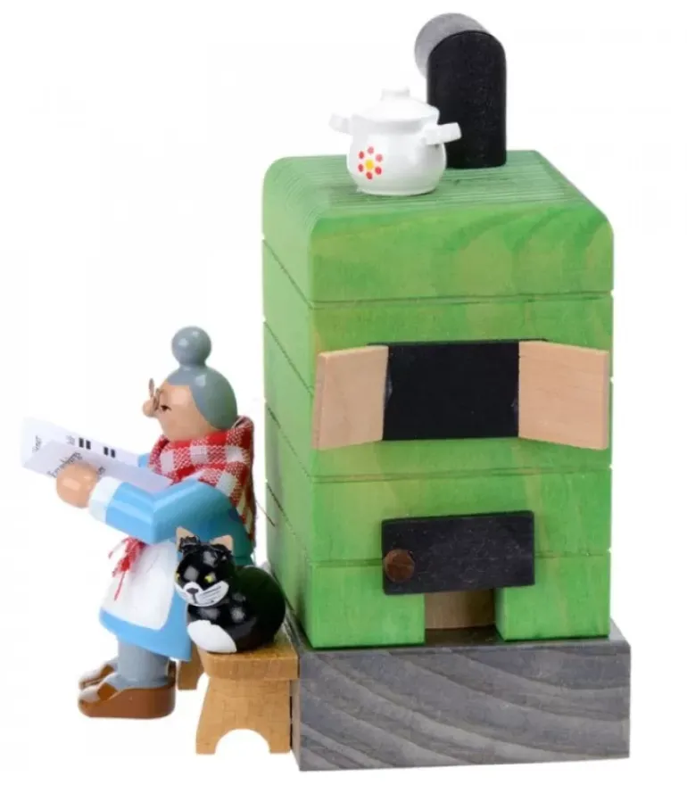 Poele En Faience Avec Grand-Mere Lisant Le Journal Et Chat.