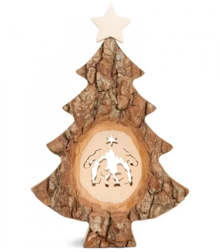 Crèche De Noël 16 Cm, Taillee Dans Une Ecorce De Bois En Forme De Sapin