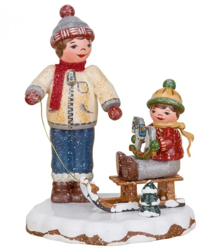 Garconnet Tirant Son Petit Frere Sur Une Luge Tenant Dans Ses Bras Un Cheval De Bois.