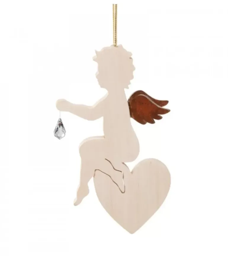 Petit Ange A Suspendre Avec Un Cristal Swarovski®, En Bois D’Erable, Assis Sur Une Grand Coeur.