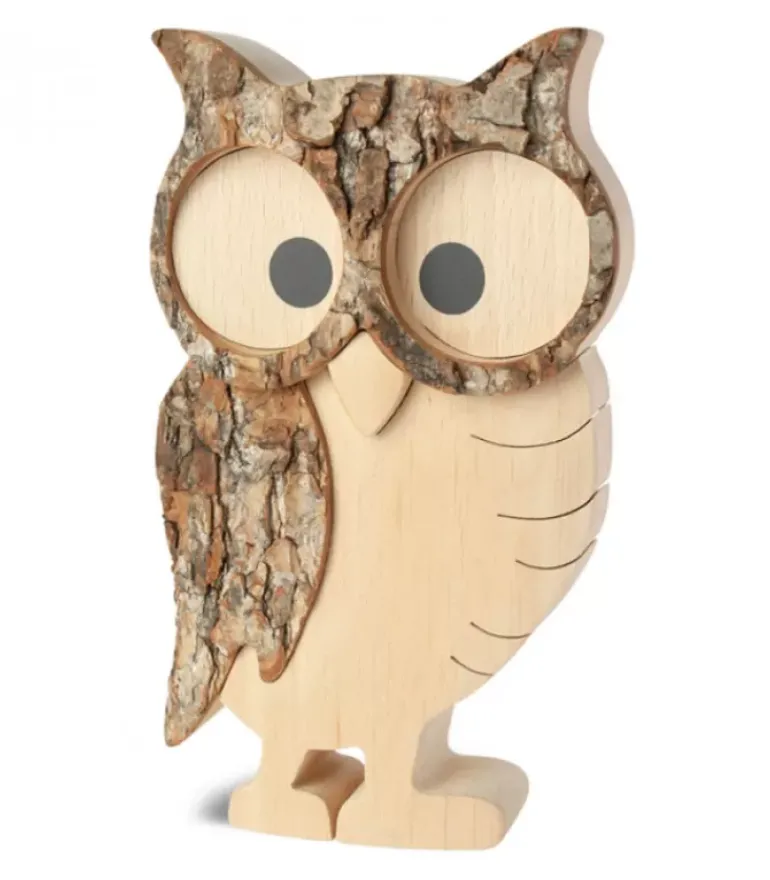 Chouette En Bois Cisele Ecorce Et Erable, 14 Cm