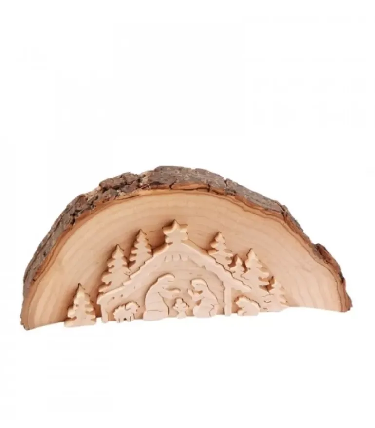 Crèche De Noël En Bois Cisele, Taillee Dans Un Demi Rondin.