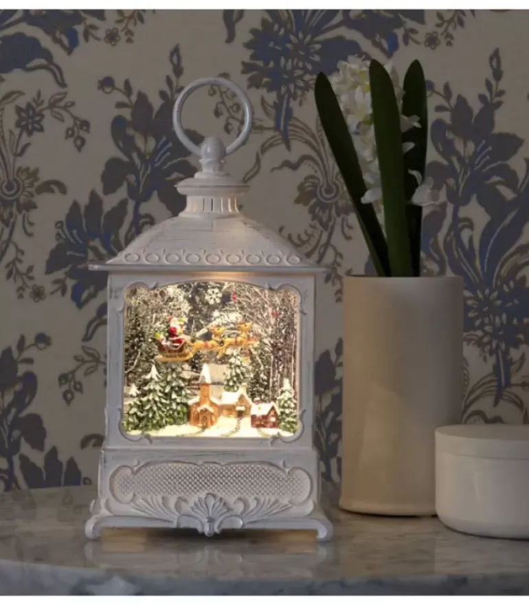 Petite Lanterne De Noël A Eau Avec Père Noël Volant Au-Dessus D’Un Village, Couleur Blanc Antique.
