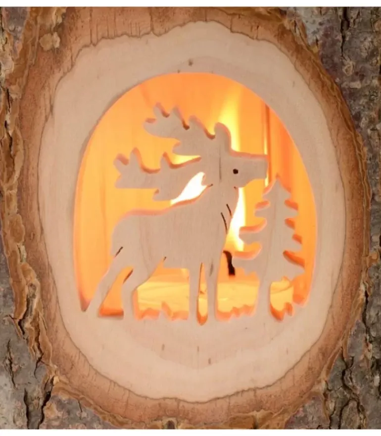 Lanterne Photophore Avec Motif D’Un Cerf En Foret En Bois Cisele Sur Chaque Cote. Equipee D’Une Anse Metal.