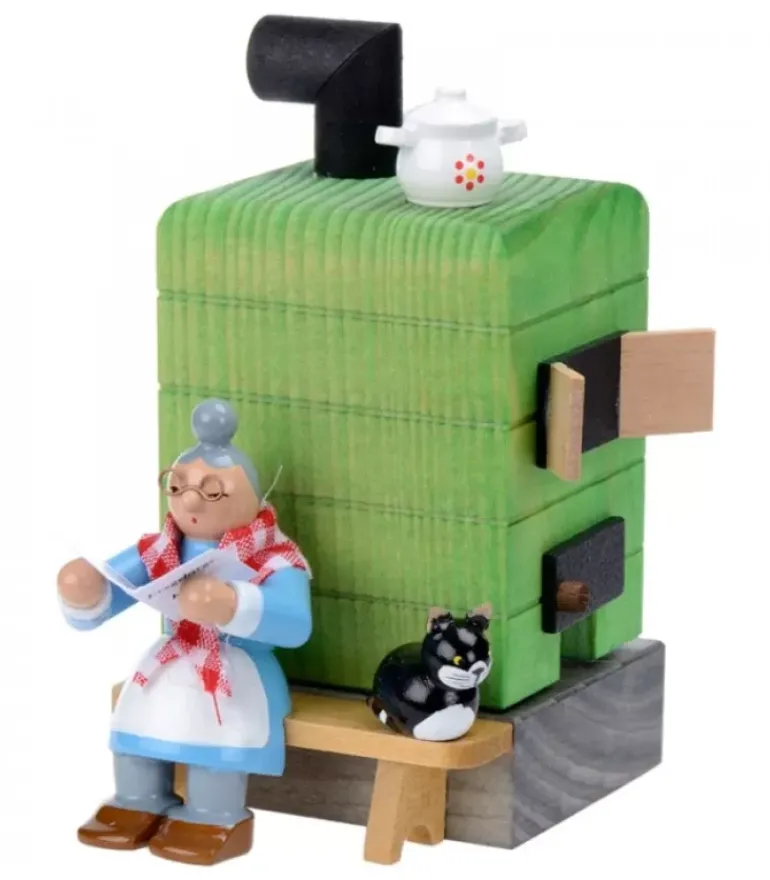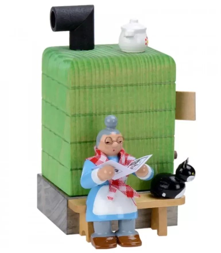 Poele En Faience Avec Grand-Mere Lisant Le Journal Et Chat.